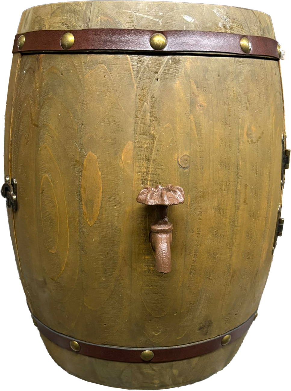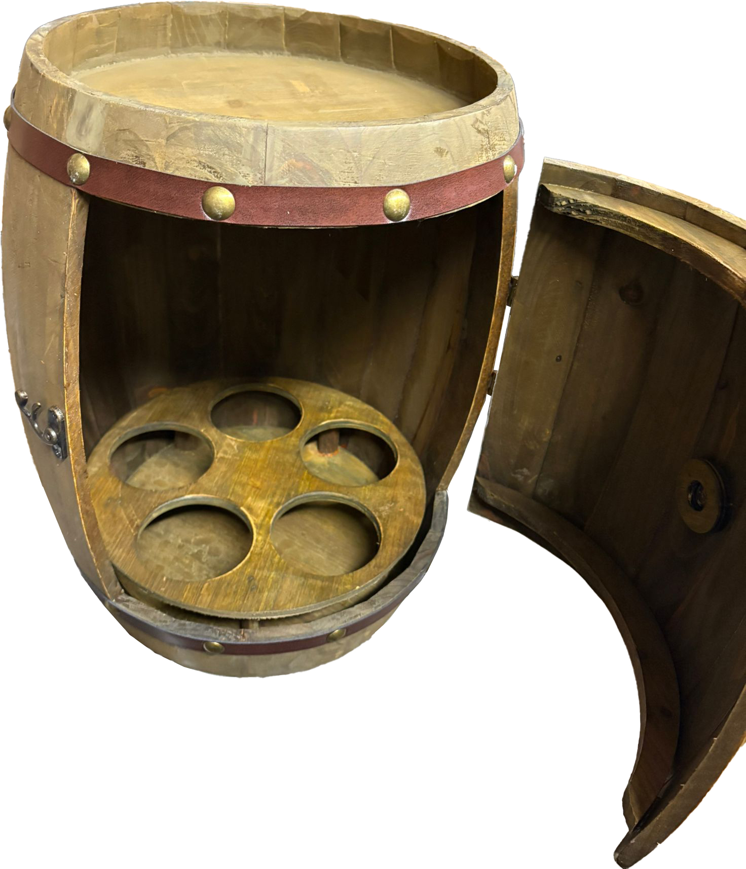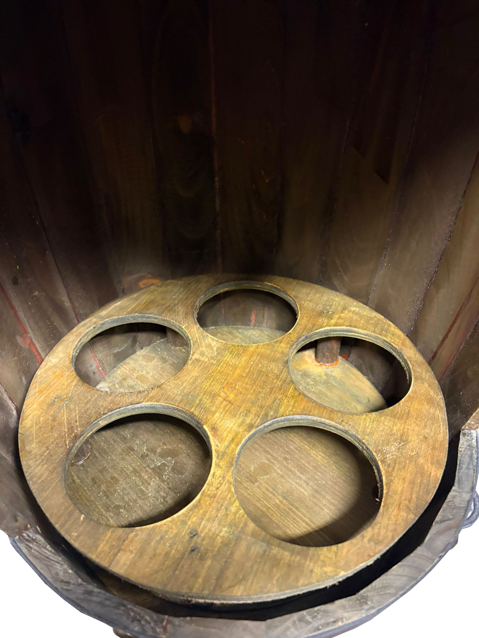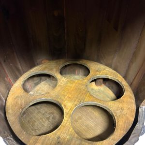 Näyttävä puutynnyrikaappi enintään viidelle viinipullolle.